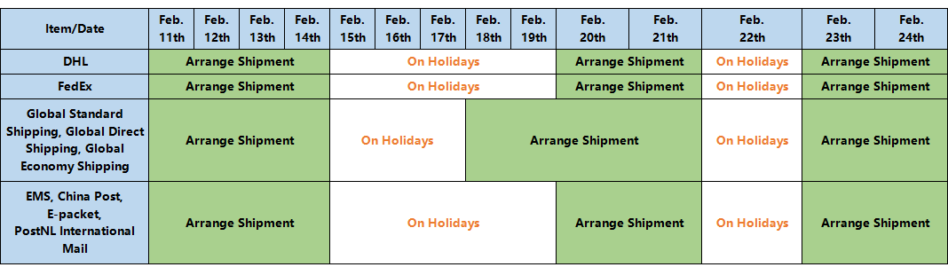 | Factory’s Production and Shipment Schedule During Chinese Spring Festival (GMT+8) | |||||||||||